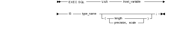 where host_variable is an input or output host variable (or host array) declared earlier in the Declare Section, type_name is the name of a valid external datatype such as STRING or RAW, length is an integer literal specifying a valid length in bytes, and precision and scale are integer literals specifying a precision and scale allowed by the equivalenced external datatype.