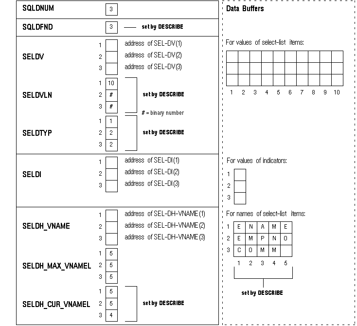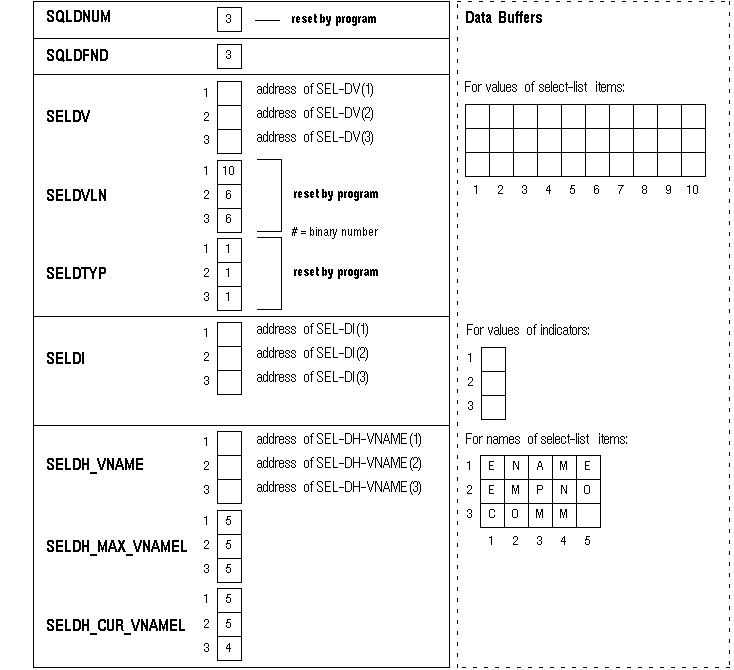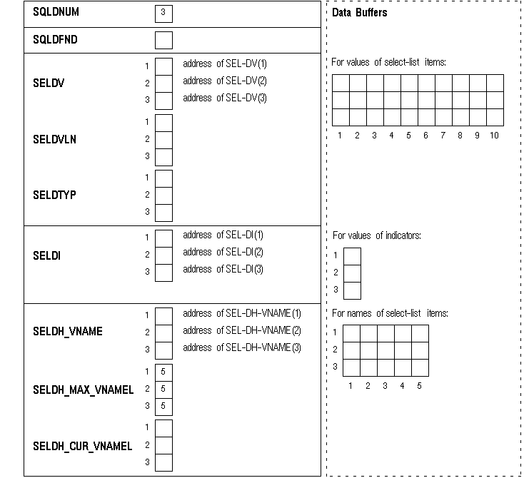 directs Oracle to store FETCHed select-list values in the data buffers addressed by SELDV(1) through SELDV(SQLDNUM). Thus, Oracle stores the Jth select-list value in SEL-DV(J).