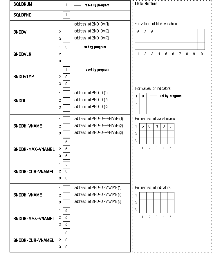 directs Oracle to execute the dynamic SQL statement using the bind-variable values addressed by BNDDV(1) through BNDDV(SQLDNUM). (Typically, the values are entered by the user.) Oracle finds the Jth bind-variable value in BND-DV(J).