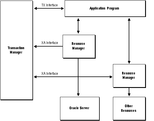 Figure 3 - 5 shows one way that components of the DTP model can interact to provide efficient access to data in an Oracle database. The DTP model specifies the XA interface between resource managers and the transaction manager. Oracle supplies an XA-compliant library, which you must link to your X/Open application. Also, you must specify the native interface between your application program and the resource managers.