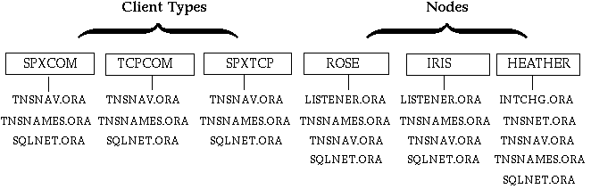 The files for the Client Profiles (or client types) include the TNSNAMES.ORA file, a SQLNET.ORA file, and a TNSNAV.ORA file. The TNSNAMES.ORA file is the same throughout the network. The SQLNET.ORA file is the same for all clients with the same client profile; it may need to be edited for optional parameters. The TNSNAV.ORA file varies depending on what protocol the clients use. The TNSNAV.ORA file used by ROSE.WORLD is the same file as other SPXCOM.WORLD clients use. Similarly, the TNSNAV.ORA file used by IRIS.WORLD is used by all clients in the TCPCOM.WORLD. Any clients of the SPXTCP.WORLD client type would have a TNSNAV.ORA file like the one for HEATHER.WORLD.