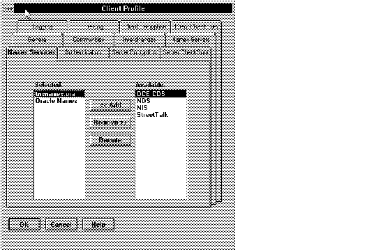 Suppose that the DCE CDS naming service was the preferred method of name resolution for the SPXCOM community in the sample network. The administrator would open the Names Services page on the Client Profile property sheet, select DCE CDS from the Available column, and would then use the Demote button to lower TNSNAMES.ORA and Oracle Names so that DCE CDS was at the top of the selected list. The Names Services page before and after this operation is shown in Figure B - 6 and Figure B - 7.