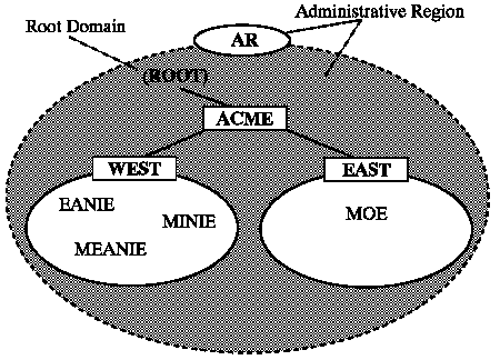 Dividing the set of names into three domains does not necessarily require three administrative regions. Administrative regions simply represent individual Network Manager installations. ACME may well determine that names can be assigned (or decided upon) by the administrator in EUROPE or ROW, but forwarded to the administrator at the ACME world headquarters in Boise, Idaho to be entered into the Network Manager.