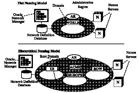 Using Oracle Names requires that you adhere to a set of organizational rules. The two most significant organizational entities when you are using Oracle Names without the Dynamic Discovery Option are domains and administrative regions.