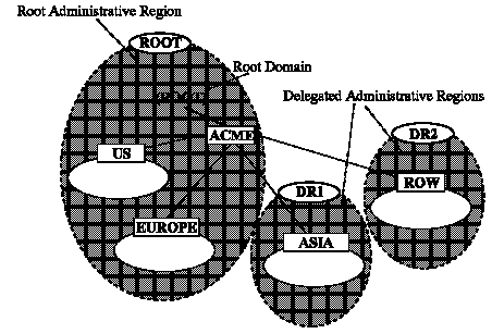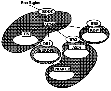 All administrative regions other than the root are hierarchically delegated directly or indirectly from it. Figure 3 - 9 shows a network with five domains and three administrative regions: the ROOT, and two delegated regions (DR1, DR2).
