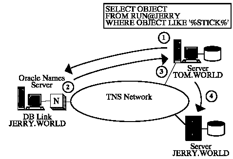 1. Server TOM receives the SQL statement shown and checks its data dictionary for a private or public database link called JERRY. When it does not find one, SQL*Net determines from the client configuration in the SQLNET.ORA file that the client's default domain is WORLD and the preferred Names Server is the one shown. SQL*Net then sends the Names Server a request to resolve the database link name JERRY.WORLD.