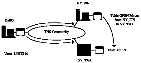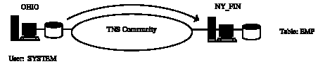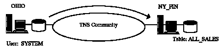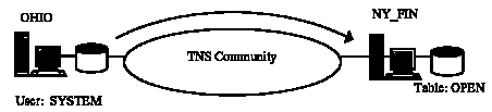 Figure 5 - 4 shows two servers, OHIO and NY_FIN, in which a database link from OHIO to NY_FIN and the synonym FOR_SALE provide an alternate object name for use in OHIO to reference the OPEN table in NY_FIN. The database link and the synonym are created as follows: