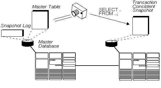 A snapshot is a full copy or a subset of a table that reflects a recent state of the master table. A snapshot is defined by a distributed query that references one or more master tables, view, or other snapshots. A database that contains a master table is referred to as the master database.