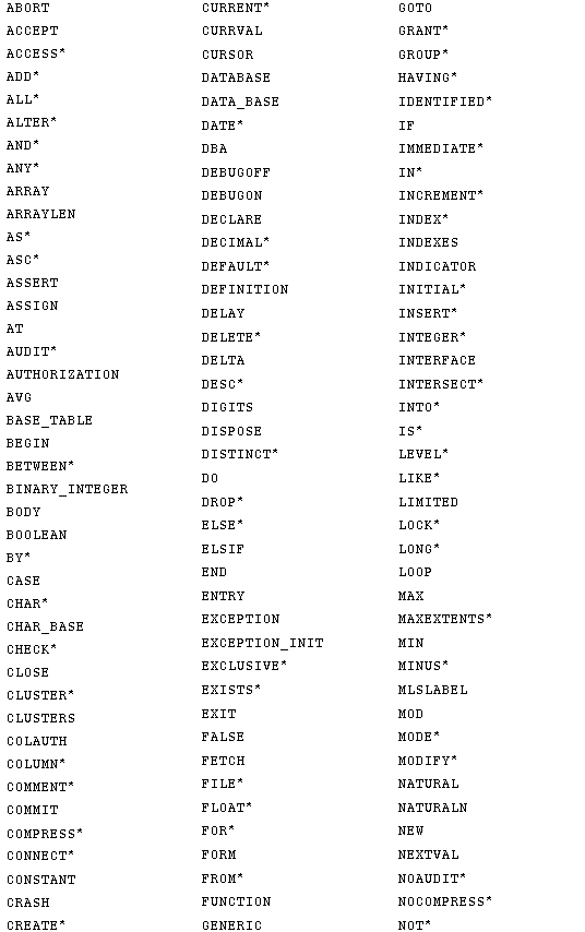 The words listed in this appendix are reserved by PL/SQL; that is, they have a special syntactic meaning to PL/SQL. So, you should not use them to name program objects such as constants, variables, or cursors. Also, some of these words (marked by an asterisk) are reserved by SQL. So, you should not use them to name database objects such as columns, tables, or indexes.