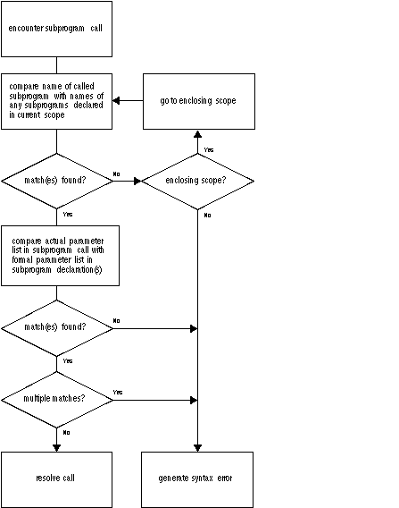 To resolve a call among possibly like-named subprograms at the same level of scope, the compiler must find an exact match between the actual and formal parameters. That is, they must match in number, order, and datatype (unless some formal parameters were assigned default values). If no match is found or if multiple matches are found, the compiler generates a syntax error.