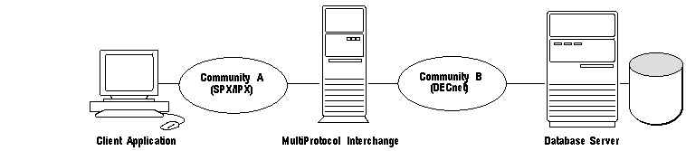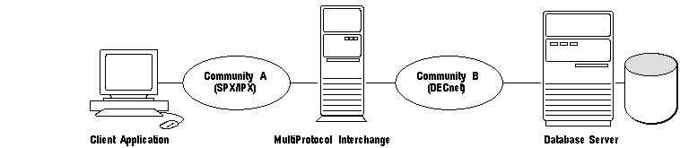 With SQL*Net version 2, the client and server can belong to different communities connected by one or more MultiProtocol Interchange(s). A community is a group of computers that can communicate using the same transport level protocol, such as TCP/IP. That is, computers that use the same protocol are members of the same community.