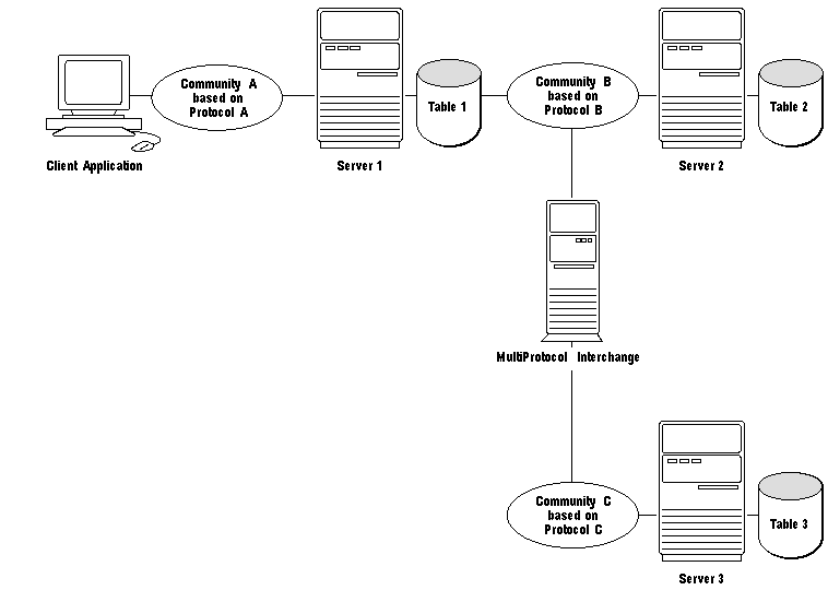 Server 1 does not have to use an MultiProtocol Interchange to initiate an additional request for data from Community B since it belongs to both Community A and Community B, but it must use an Interchange to access a server in Community C.