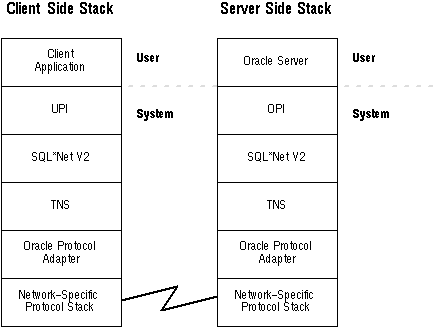 Communication between client and server proceeds in a stack-like fashion with corresponding levels communicating in a peer relationship. The logical exchange unit at each layer of the stack conveys the level of generalization employed at that level. The Oracle client and server exchange SQL statements and data rows. At the UPI/OPI (User/Oracle Program Interface) layers, these exchanges translate into series of calls to SQL routines such as logon, parse, execute, and fetch. The SQL*Net layer handles these calls as a series of Oracle send/receive messages, and TNS in turn processes the packets over the network. The network protocol, not provided by Oracle (typically provided with each particular platform by its vendor), guarantees a reliable means of communication between the two tasks.