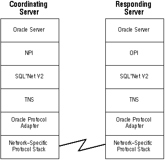 In a distributed transaction, SQL*Net is responsible for sending information across various networks on behalf of a client application or database server. In such a configuration, there are commonly two types of computers acting as the client and server. Two-Task Common (see page 2 - 14) ensures that all differences between clients and servers, such as internal datatype representations or NLS character sets, are resolved, allowing the client and server to communicate transparently. SQL*Net relays all communication tasks to TNS through its common entry points. SQL*Net is unaffected by the specific communication mechanism used underneath TNS (for example, TCP/IP, DECnet, shared memory, and so on).