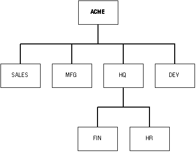 In this figure, each of the boxes represents a separate domain. The domains are related hierarchically; that is, FIN and HR are the children of HQ, which is one of the children of ACME. A network object (such as an Interchange or a server) within a given domain has a unique name within that domain. This is generally manageable because one or at most a few people have authority to pass out names for that domain. The global name for that object includes the parent domains.