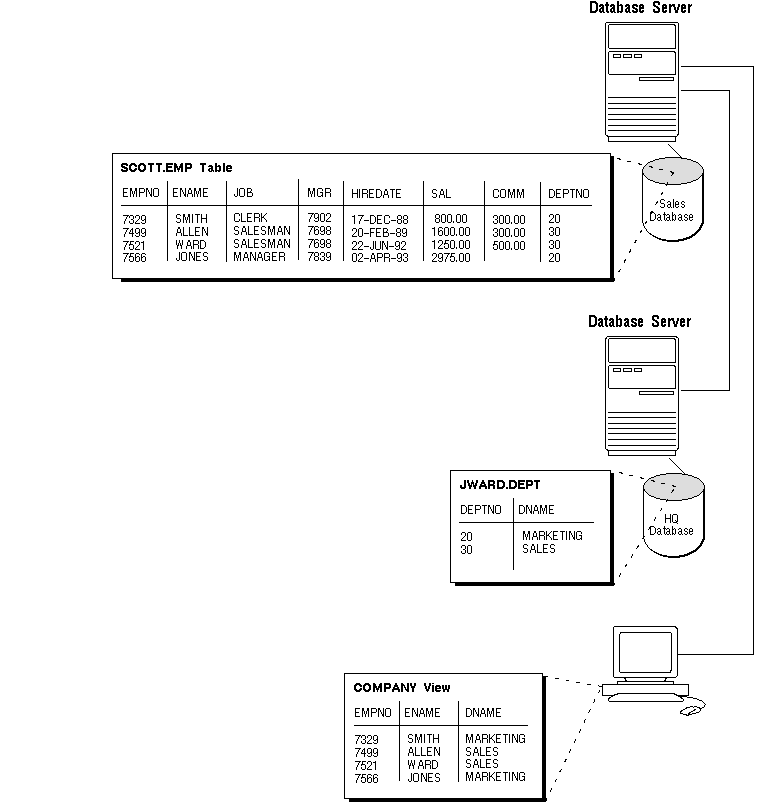 For example, assume that table EMP is stored in a local database. Another table, DEPT, is stored in a remote database. To make the location of, and relationship between, these tables transparent to users of the system, a view named COMPANY can be created in the local database that joins the data of the local and remote servers: