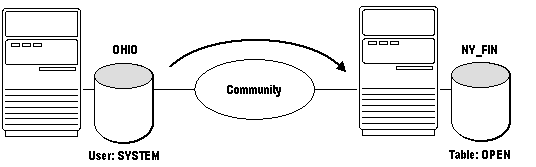 This query initiates a connection from OHIO to NY_FIN to the common account FINPUBLIC. The query is processed on NY_FIN, and data from the table ALL_SALES are returned to OHIO.