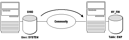Users connected to OHIO.SALES.ACME can use the NY_FIN.HQ.ACME database link to connect to NY_FIN.HQ.ACME with the same username and password they have on OHIO.SALES.ACME. To access the table on NY_FIN.HQ.ACME called EMP, any user could issue the SQL query: