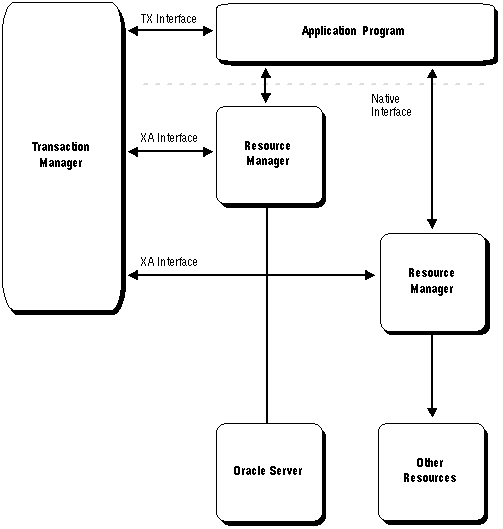 Because the TM controls distributed commits or rollbacks, it must communicate directly with Oracle (or any other resource manager). It communicates through the Oracle XA library interface.