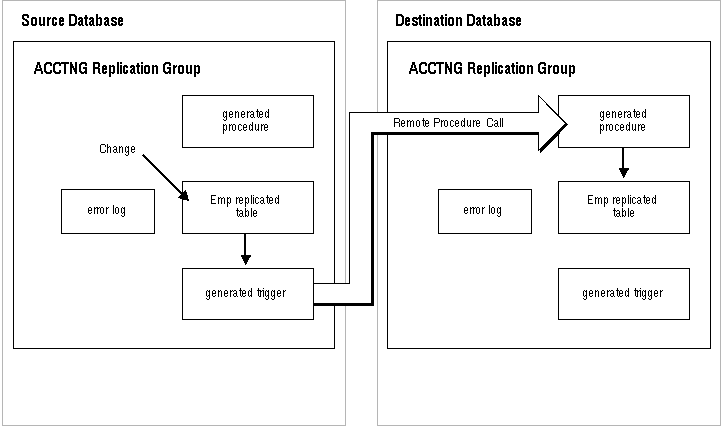 As shown in Figure 1 - 7, when you make a change to a replicated table, Oracle fires a trigger which calls a packaged procedure at each master site that applies the change.