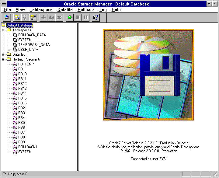 After the Storage Manager Connects to a database, the Tablespaces, Rollback Segments, and Datafiles folders display in a navigator on the left side of the Storage window. These folders are contained in the database folder which displays the name of the database that the application is connected to.