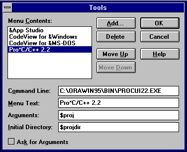 - Enter a suitable name, such as Pro*C/C++ 2.2, in the Menu Text field.
