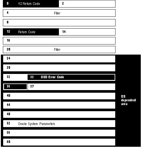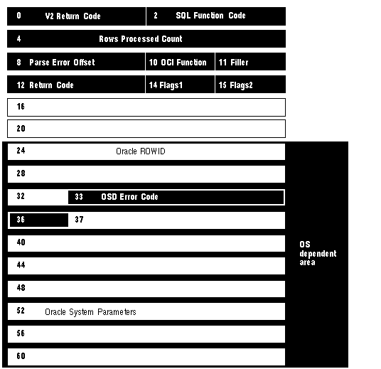 Figure 2 - 2 shows the structure of a CDA for a typical 32-bit system. The lengths of the fields in the CDA, and hence the offsets of the fields, are system dependent. However, all fields are present for all systems. The CDA is always 64 bytes, but check your Oracle system-specific documentation for the exact configuration of the CDA.