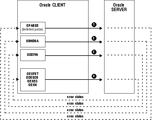 As Figure 2 - 5 demonstrates, when the parse is not deferred, error codes are returned as soon as each call is made to the server. When the parse is deferred, as in Figure 2 - 3 and Figure 2 - 4, error codes for the parse, bind, and define steps are not returned until the describe or execute call is performed.
