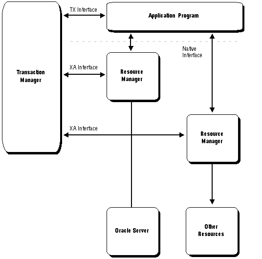 Figure 2 - 11 shows one way that the components of the DTP model can interact to provide consistent and efficient access to data in an Oracle database. The DTP model specifies the XA interface. Oracle provides an XA-compliant library to be linked into your applications. The native interface is the OCI API.