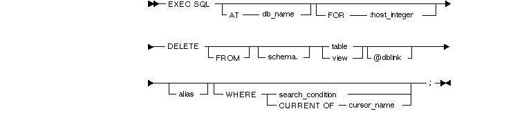 where db_name identifies a non-default connection, FOR :host_integer specifies the maximum number of host array elements processed, table_name identifies the table from which rows will be deleted, alias is another name assigned to the table, search condition is a boolean expression containing references to host variables or host arrays, and cursor_name refers to a cursor defined in a previous DECLARE CURSOR statement.