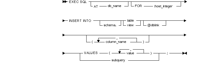 where db_name identifies a non-default connection, FOR :host_integer specifies the maximum number of host array elements processed, INTO table_name identifies the table to which rows will be added, column_name identifies a column for which a value is provided, VALUES introduces a row of values to be inserted, subquery is a SELECT statement with no INTO clause, and value stands for the following syntax: