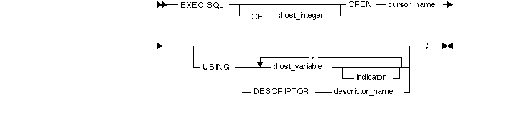 where FOR :host_integer specifies the maximum number of host array elements processed, cursor_name refers to a cursor defined in a previous DECLARE CURSOR statement, USING specifies a descriptor or a list of host variables substituted for placeholders in a PREPAREd string, descriptor_name identifies a descriptor referenced in a previous DESCRIBE statement, and indicator stands for the following syntax: