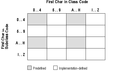 Each of the five characters in a SQLSTATE value is a digit (0..9) or an uppercase Latin letter (A..Z). Class codes that begin with a digit in the range 0..4 or a letter in the range A..H are reserved for predefined conditions (those defined in SQL92). All other class codes are reserved for implementation-defined conditions. Within predefined classes, subclass codes that begin with a digit in the range 0..4 or a letter in the range A..H are reserved for predefined subconditions. All other subclass codes are reserved for implementation-defined subconditions. Figure 5 - 1 shows the coding scheme.