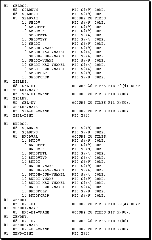 You might want to store the SQLDAs in files (named SELDSC and BNDDSC, for example), then copy the files into your program with the INCLUDE statement as follows: