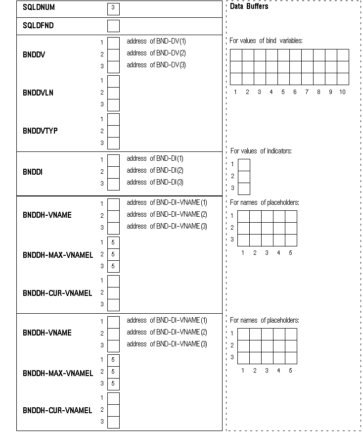 directs Oracle to execute the dynamic SQL statement using the bind-variable values addressed by BNDDV(1) through BNDDV(SQLDNUM). (Typically, the values are entered by the user.) Oracle finds the Jth bind-variable value in BND-DV(J).