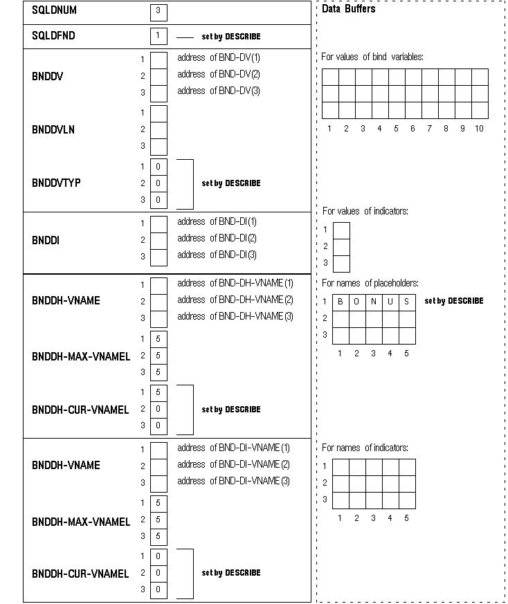 DESCRIBE BIND VARIABLES directs Oracle to store any indicator-variable names in the data buffers addressed by BNDDI-VNAME(1) through BNDDI-VNAME(SQLDNUM). Thus, Oracle stores the Jth indicator-variable name in BND-DI-VNAME(J).