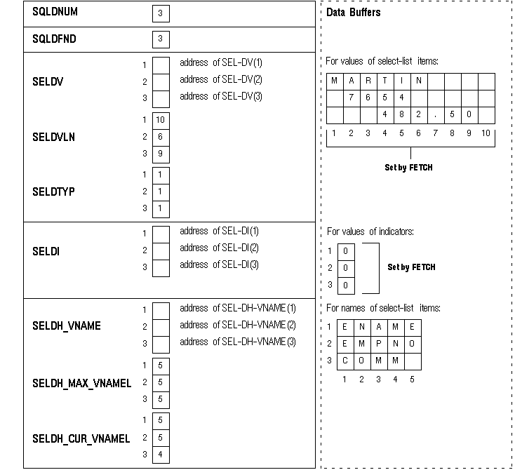 directs Oracle to store FETCHed select-list values in the data buffers addressed by SELDV(1) through SELDV(SQLDNUM). Thus, Oracle stores the Jth select-list value in SEL-DV(J).