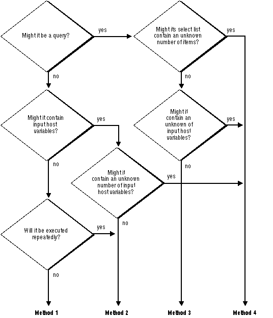 Each succeeding method imposes fewer constraints on your application, but is more difficult to code. As a rule, use the simplest method you can. However, if a dynamic SQL statement will be executed repeatedly by Method 1, use Method 2 instead to avoid reparsing for each execution.