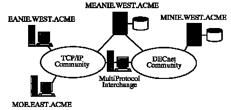 Note that EANIE and MOE are in the same community but different domains. EANIE MEANIE, and MINIE are all in the same naming domain, but are in different MultiProtocol Interchange community combinations (TCP/IP and DECnet, respectively).