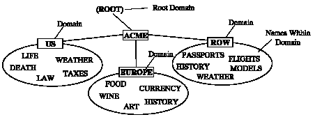 Within each domain all names must be unique, but across domains they can be repeated. Notice that both WEATHER and HISTORY are repeated, but the full global names are unique (that is, HISTORY.ROW.ACME vs. HISTORY.EUROPE.ACME).