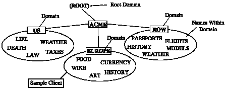 Figure 3 - 6 shows a hierarchical naming model with five domains: the (ROOT) domain, ACME domain, US.ACME, EUROPE.ACME, and ROW.ACME (Rest of World) domains.