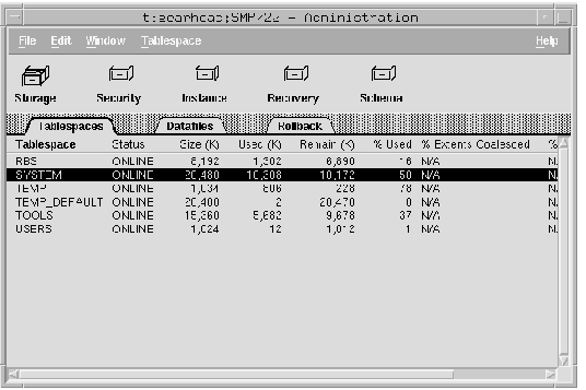 The following figure illustrates the Administration Manager with the Tablespaces folder open.