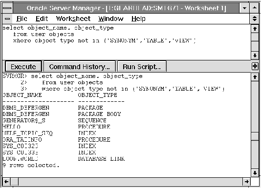 A SQL Worksheet allows you to dynamically enter SQL statements, PL/SQL code, and Server Manager commands. You can also run scripts from a SQL Worksheet.
