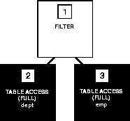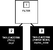 This example shows the execution plans for two SQL statements that perform the same function. Both statements return all the departments in the DEPT table that have no employees in the EMP table. Each statement searches the EMP table with a subquery. Assume there is an index, DEPTNO_INDEX, on the DEPTNO column of the EMP table.