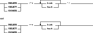 A statement block can have only one Comment containing hints. This Comment can only follow the SELECT, UPDATE, or DELETE keyword. The syntax diagrams show the syntax for hints contained in both styles of Comments that Oracle supports within a statement block.