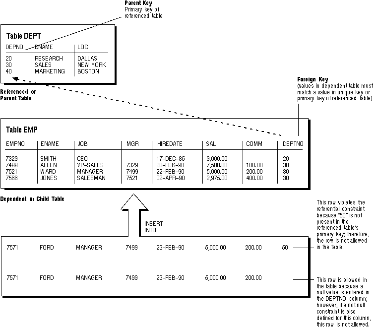 Figure 6 - 3 shows a foreign key defined on the DEPTNO column of the EMP table. It guarantees that every value in this column must match a value in the primary key of the DEPT table (the DEPTNO column); therefore, no erroneous department numbers can exist in the DEPTNO column of the EMP table.