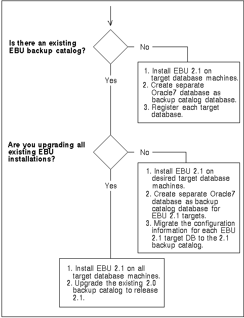 7. Create a release 2.1 backup catalog. The method for doing this depends on whether you have a release 2.0 catalog, and whether you will continue to have target database running EBU release 2.0, even after installing EBU 2.1 on some target databases.