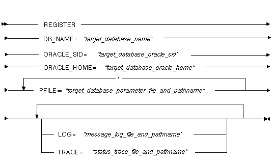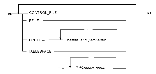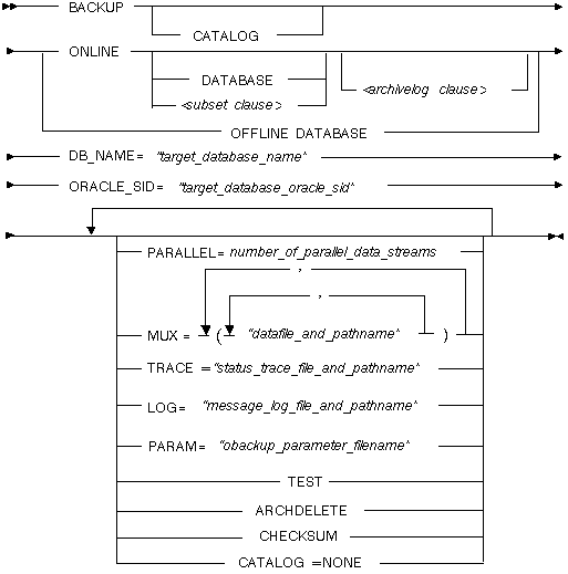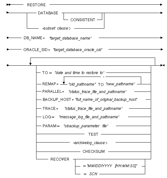 DB_NAME ="database_name" ORACLE_SID = "target_database_oracle_sid" [TO = "date_and_time_to_restore_to"] [REMAP = "old_pathname" to "new_pathname" [,"old_pathname" to "new_pathname"]....] [PARALLEL = number_of_parallel_data_streams] [BACKUP_HOST = "full_name_of _original_backup_host"] [ARCHIVELOG [=["archivelog_directory_name" [,"archivelog_directory_name"]...]|[NONE]] START_LSN = LSN] [LOG = "message_log_file_pathname"] [TRACE = "status_trace_file_pathname"] [PARAM = "Obackup_parameter_file_pathname"] [TEST] [RECOVER [TO [SEQ]]] [CATALOG]