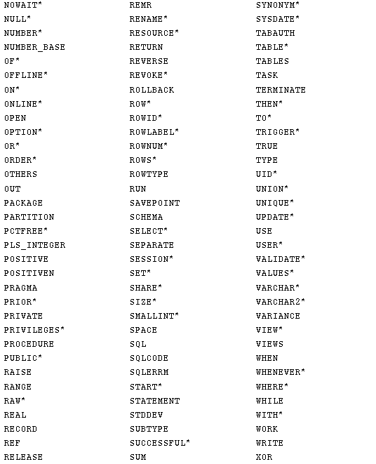The words listed in this appendix are reserved by PL/SQL; that is, they have a special syntactic meaning to PL/SQL. So, you should not use them to name program objects such as constants, variables, or cursors. Also, some of these words (marked by an asterisk) are reserved by SQL. So, you should not use them to name database objects such as columns, tables, or indexes.