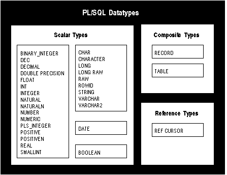 Figure 2 - 1 shows the predefined datatypes available for your use. An additional scalar type, MLSLABEL, is available with Trusted Oracle, a specially secured version of Oracle. The scalar types fall into four families, which store number, character, date/time, or Boolean data, respectively.